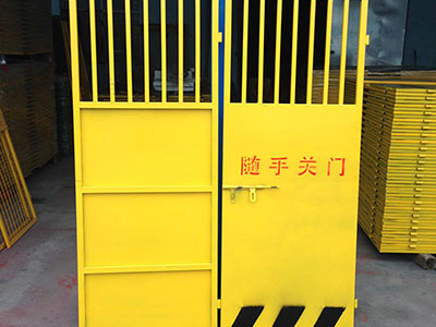 電梯安全門一般通常使用方鋼、圓鋼、角鋼等鋼管焊接而成。產(chǎn)品制作嚴(yán)格按圖施工,尺寸正確,焊接點(diǎn)牢固,達(dá)到安全防護(hù)之目的,電梯安全門采用美術(shù)亮黃色、藍(lán)色、白色、等幾個(gè)顏色,門下部檔架板一般采用黃、黑間隔和白、紅間隔作為警示線。電梯防護(hù)門是建筑施工現(xiàn)場(chǎng)預(yù)防人身傷害的防護(hù)設(shè)施,它適用于多類建筑施工工地。